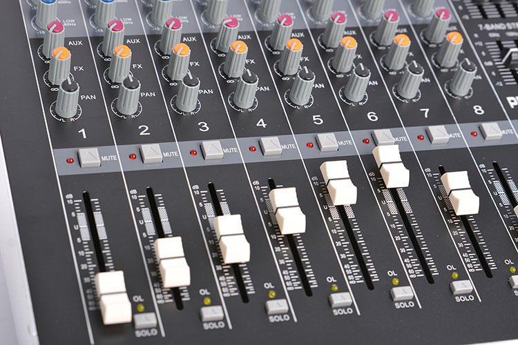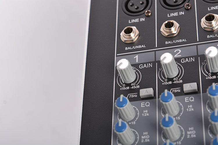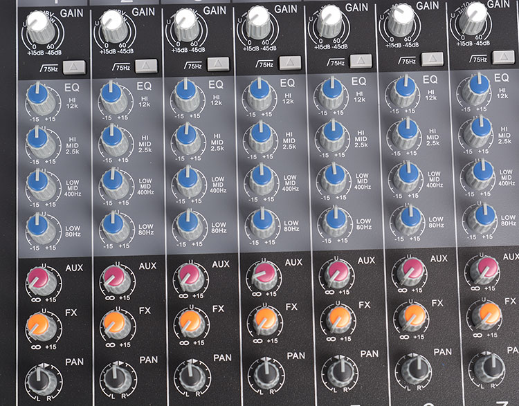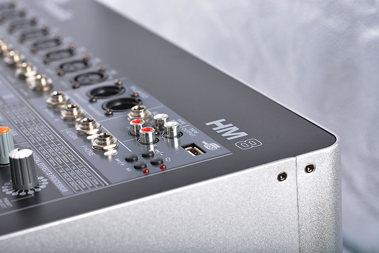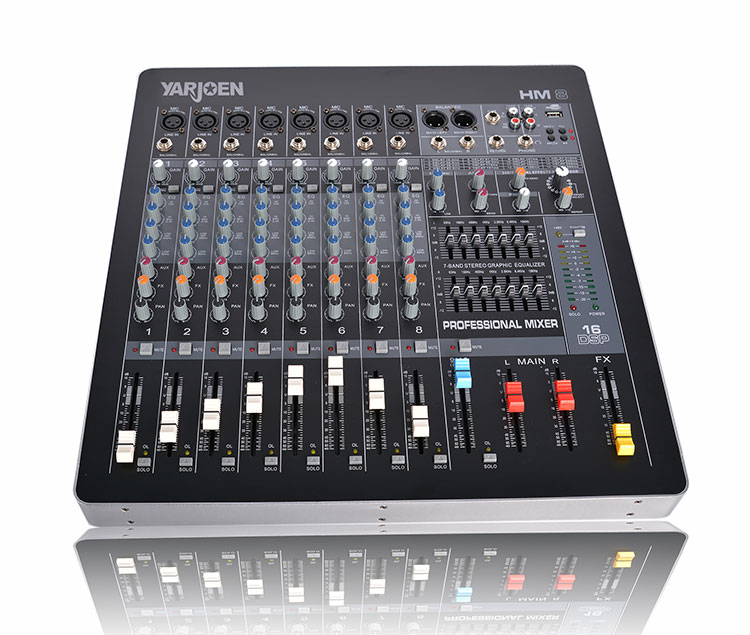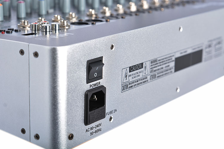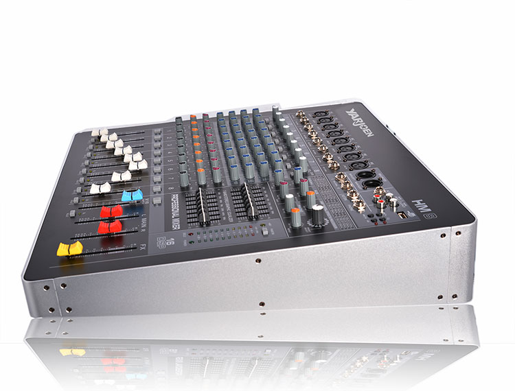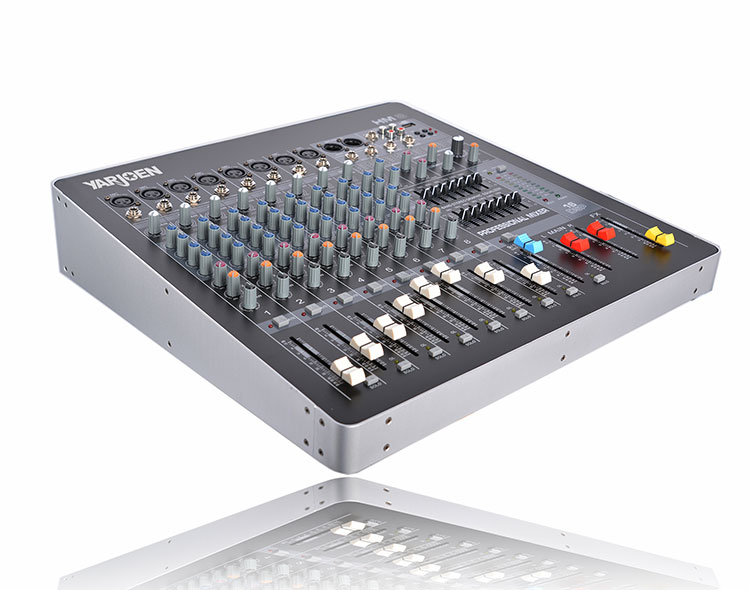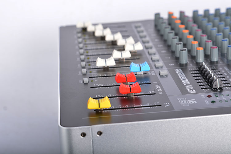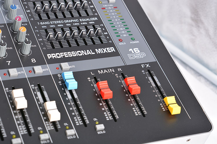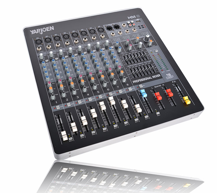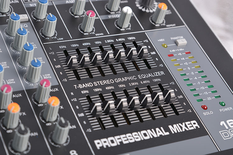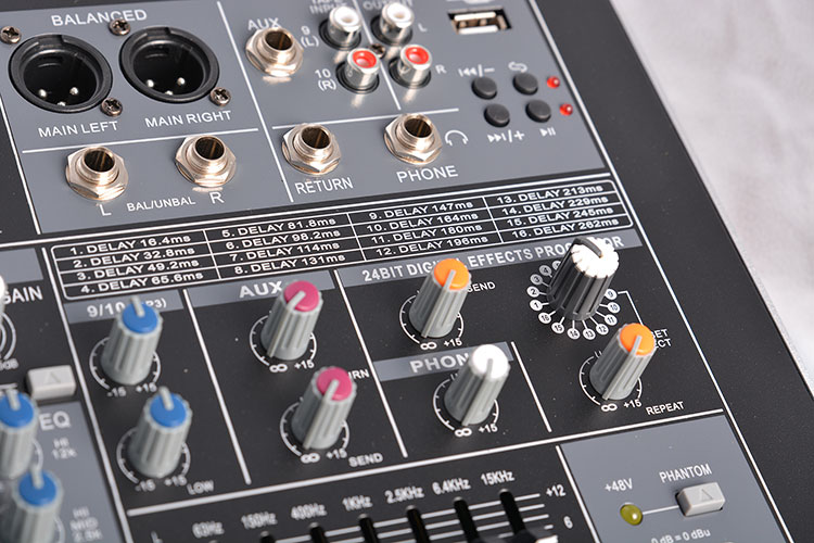8\12\16路优质模拟调音台,单声道精准的4段均衡。双七段均衡,内置16种普通延时效果,USB播放。