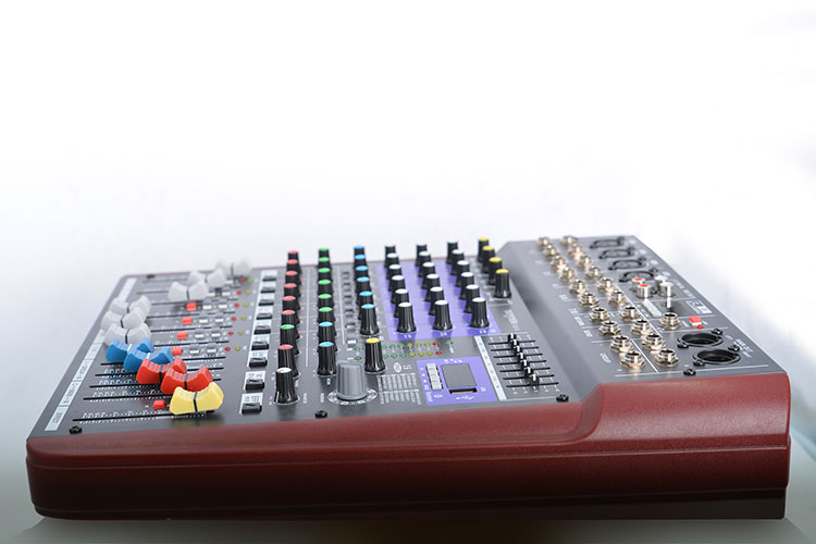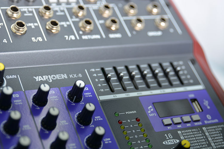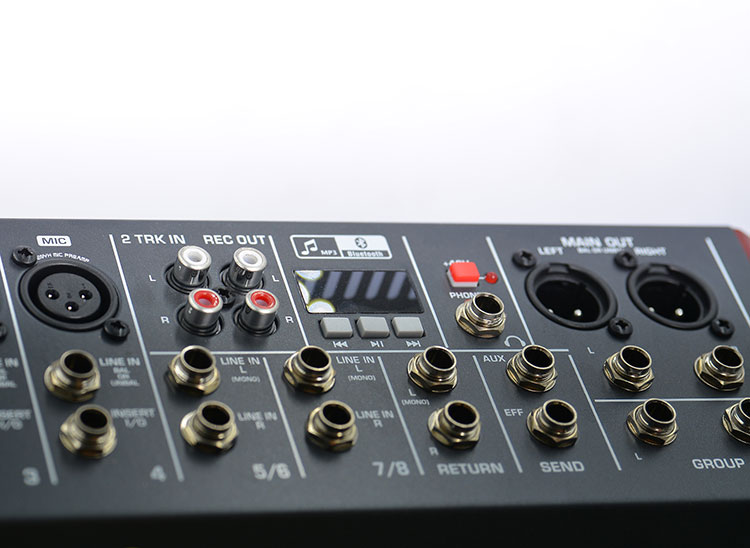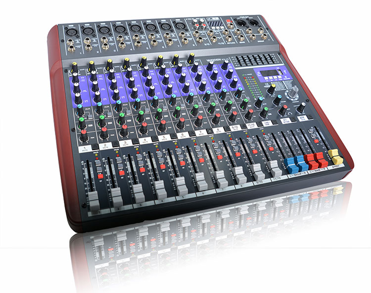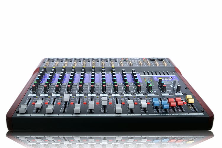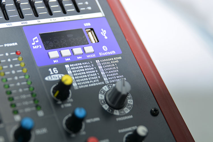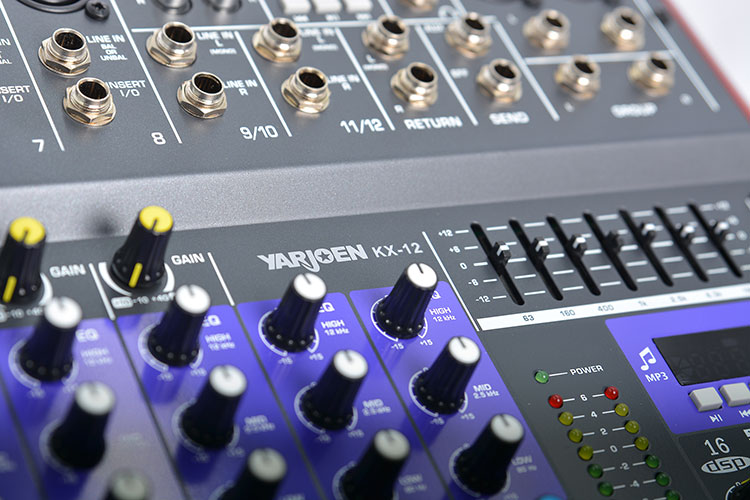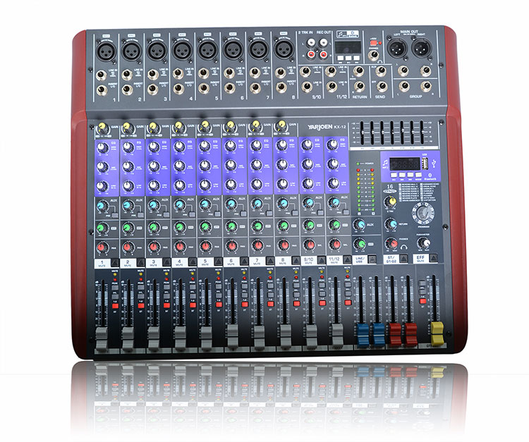 8\12\16路单声,通道三段均衡,一组辅助发送,一组效果发送,内置数字效果器,60mm精密推拉电位器。