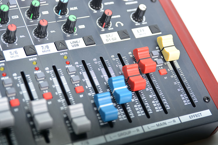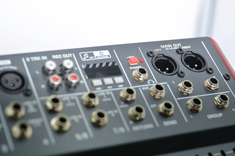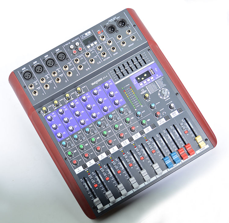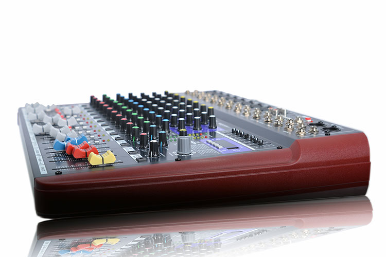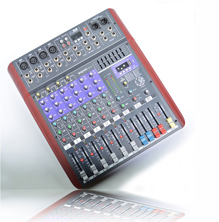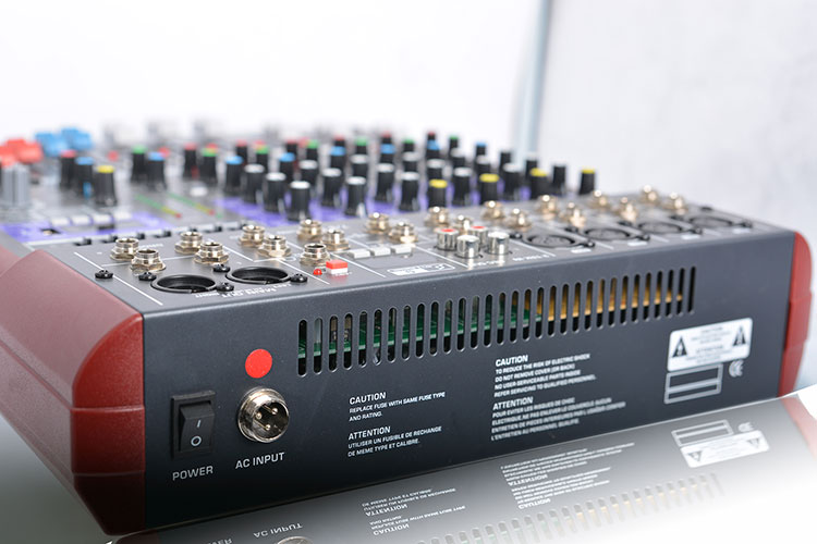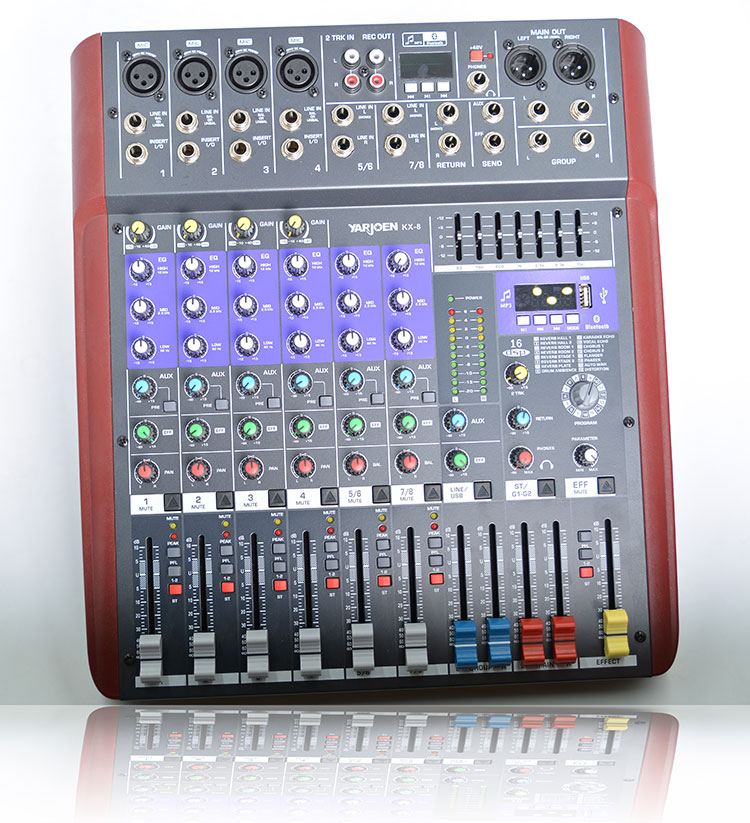 8\12\16路单声,通道三段均衡,一组辅助发送,一组效果发送,内置数字效果器,60mm精密推拉电位器。