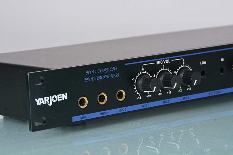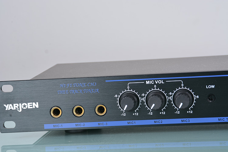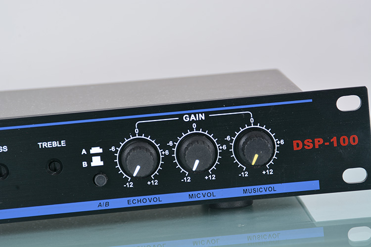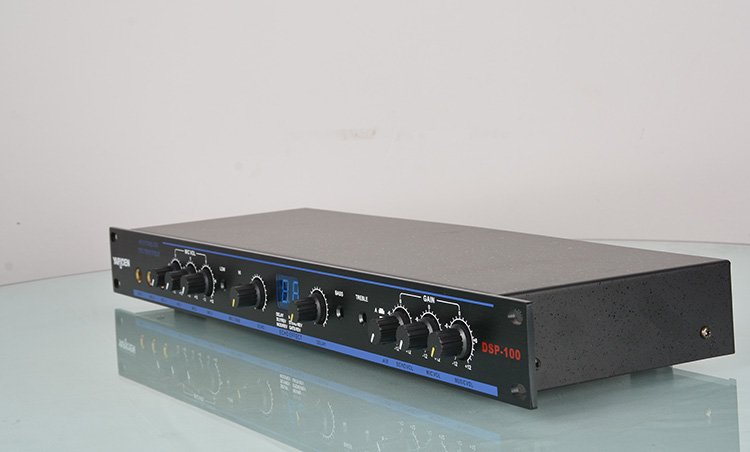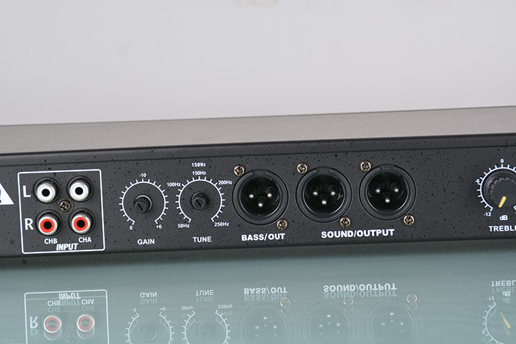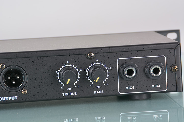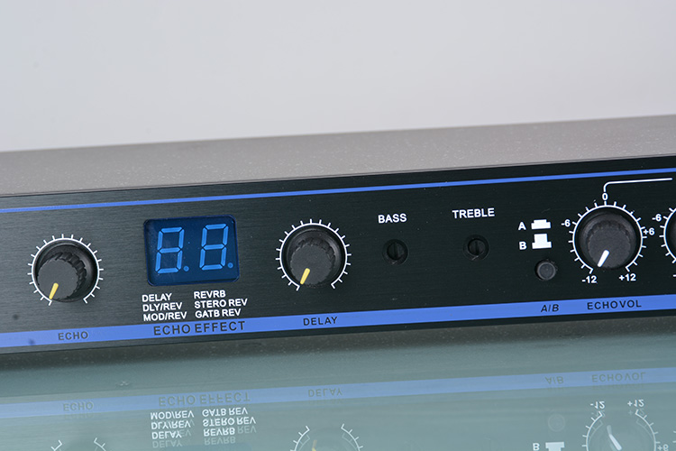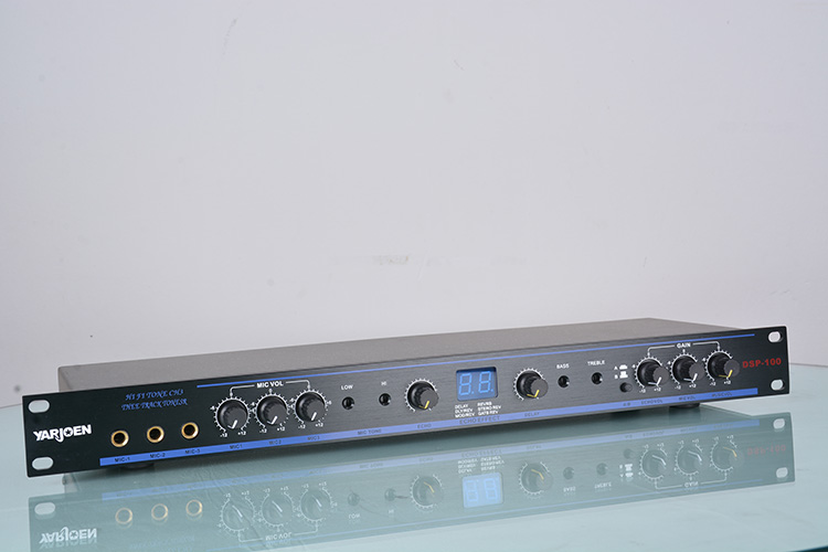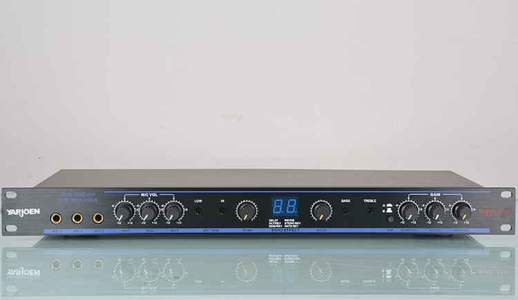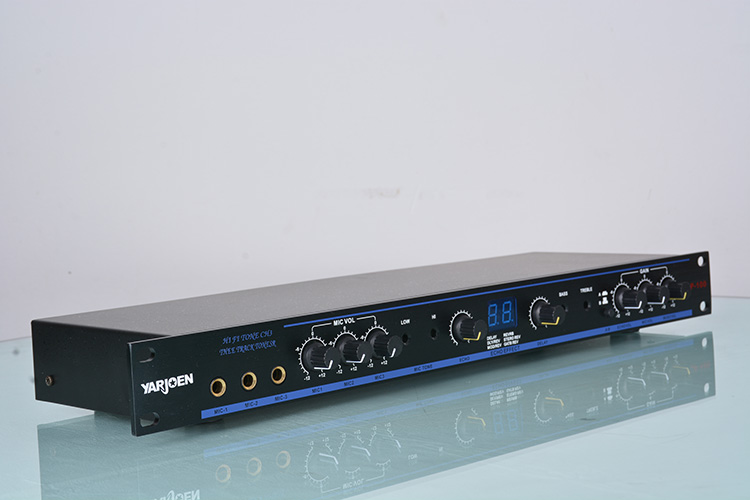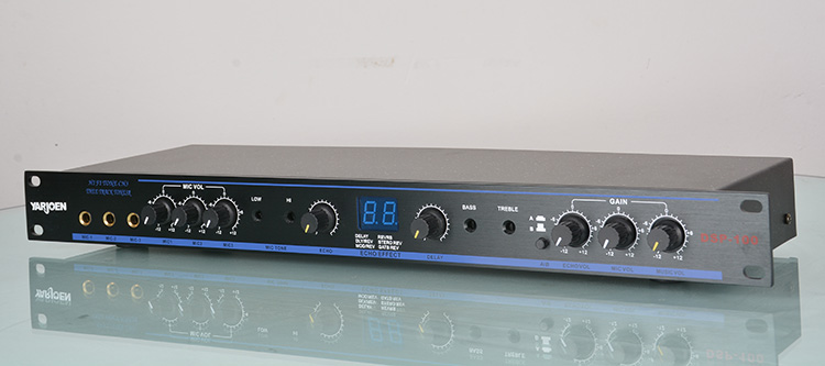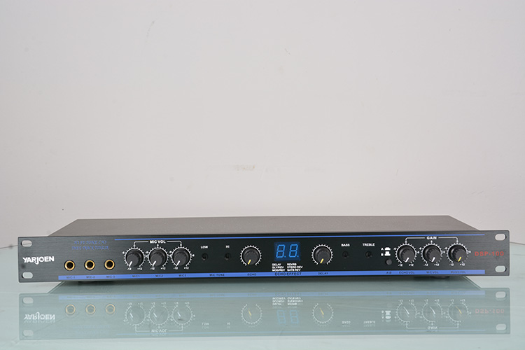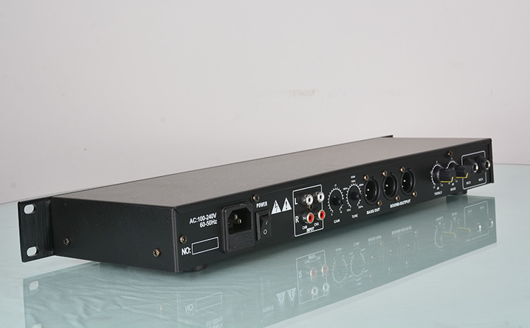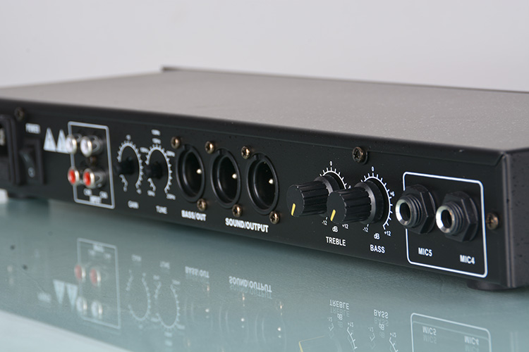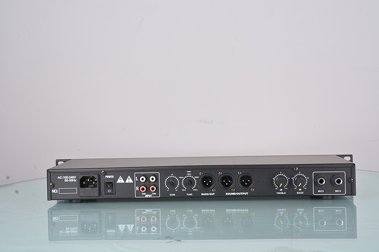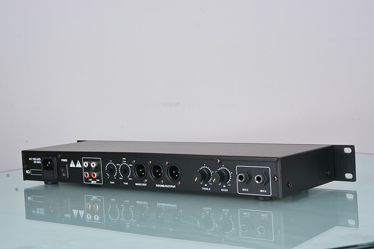 功能增加了当话筒有输入时自动切断超低音,不用手动关闭,还有全部输出升级为更专业的卡龙接口。本机是专为专业卡拉OK而设计。5路话筒输入(前3后2)。有99种数码混响效果。让你记住不同环境中你最喜爱的混响效果值。音乐、混响、麦克风独立音量调整;内置超低音输出,分频点可调;麦克风高音、低音、混响、混响时间全部独立调整,使演唱更专业、轻松、自如。有激励功能,激励频点可调,可直通,也可以随意调节!